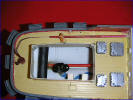 This is another Lindberg conversion of one of their �classic� range, which are still occasionally available. The main aim was to have a small boat with plenty of character at low cost. The �low cost� aim meant NO MINIATURE COMPONENTS! Weighing showed that there was a maximum payload of 12oz. The hull looked like a good stable proposition, which was handy as I wanted to use as much of the supplied detail as possible. My version of weighing consisted of bunging the hull holes (for prop-shaft and rudder fittings) with plasticine, then mounting the hull on a flat surface with a strong light behind it, and the pouring in water until the waterline was reached. This water was then poured into a measuring jug, and the answer read off in fluid ounces. The rest of the kit was then weighed, and, to allow for the weight of the sprues, divided by two, and this subtracted from the hull water. This is a good guide figure for the payload, or the answer to �Will it carry a radio, motor, speed control, batteries, etc��. If you weigh these items and they weigh less than you payload, you shout �Hooray!!� and carry on, if not, you have a re-think. Luckily, this was a �Hooray�, but only just. Next step is to look carefully at all of the bits and try to figure out where the changes will be needed to make it into a working model. I have this belief that it should be possible to change any part without demolishing the model, so access has a high priority. In this case, there is very little freeboard around the after deck, so that needs to be sealed. Fortunately there is the bait house there, so that can be made removable, and mounted over a coaming almost the height of the house itself. On this particular boat, the rudder is very close to the stern. The low freeboard makes a water-tight under-deck tiller difficult, with access impossible, so the tiller arm will go above deck. This also implies running a linkage to connect it above deck. This was to be rendered invisible by painting it bright red - anybody seeing it will automatically assume that it is supposed to be there! So, the after deck was fitted, with its� forward bulkhead, and four freeing ports added at deck level to help drainage. The batteries (5 of AAA) and a charging socket live under here, along with the prop tube and the rudder tube, a piece of drinking straw tube cemented top and bottom. Access via the main deck is for crystal changing (so that I don�t have to be stuck without a sail), and for switching power on and off. This can be done through a hole in the deck under the main superstructure. Most other jobs could be done through this hole, but I decided that it was much easier to be able to remove the entire deck - if there is ever more than a slight splash on that deck, the entire boat is in so much trouble that it would probably have been overwhelmed anyway. The superstructure was also located using a high coaming. All coamings and other bits of extra structure were made from 0.8mm styrene sheet. Past experience has shown that it is a sound idea on this kind of model to cut out as much unnecessary plastic decking as possible. In this case, Lindberg have already done that part of the job. The prop shaft was made from a length of 1.6mm brass wire. The kit prop was used, carefully (and VERY slowly) drilling down through the centre of the boss, and the epoxying the shaft in place. Bearings were cut from Johnsons cotton bud shafts, and the outer tube from a plastic drinking straw (the small diameter, thick-walled type), the bearings being epoxied in place. He coupling used was a rubber tube type, and a thrust bearing made up from a length of cotton bud tube and a brass collar. The motor used was rescued from a dead CD player - an almost perfect replacement for a servo motor, having a longer shaft. The speed control was the electronics from an old servo, with the motor removed and the CD player motor wired in its� place. The dead band is narrow going on for non-existent, but at these prices, who cares? The steering servo is a standard size device, laid on one side under the motor, the ESC living just astern of that. The rudder linkage was made up from lengths of 22g nickel silver wire (point control wire left over in the scrap box from my model railway days), the sections being joined using brass collars and screws from a 5amp mains through connector (6 collars and screws, �1:50). A new rudder was made up from styrene sheet, using the original as a pattern. The receiver was mounted on a shelf in the bow, with the battery pack (5 of AAA NiMH) in a sausage string around the stern. I did put some heat shrink tube on these, but I feel that missing this and using a bit more ballast might have been more useful). The switch, a charging resistor and a small bridge rectifier (saves remembering what polarity the charger has to be) were hung on the wiring loom on the starboard side. Art each stage, a float test was carried out, taking the opportunity to adjust the position of any items, and all was going well until I fitted the mast. The beast came out in its� true colours them, and refused to sit upright. I lowered the C of G a bit by slotting the receiver shelf, and mounting the receiver on a steep slant. Not quite stable yet, but there was still some reserve buoyancy, so I made a 1� oz lead block, and inserted that under the speed control. The boat is now stable in anything but a strong side-wind, when it leans, but then, with all that upstairs and precious little downstairs, this is to be expected. It is a 1 mile walk around the side of the lake where I do most of my sailing, and on a still day it looks good all the way round when accompanying me, and still plenty of life left in the batteries for cruising up and down afterwards. The walk round takes about an hour, which is probably about right for a 1:120 scale fishing boat. Malcolm Faray