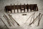 False keel. Any old plywood I can find at home.Masts, yardarms, davits,