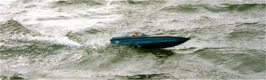 A NEW PROBLEM After about a month of successful weekends of running and tuning a problem set in. It would run OK until at very high speed then the engine would suddenly stall without warning. On recovering the boat it would start again immediately without any hesitation. It would run at half speed all day long but cut after about 10 seconds at full throttle. Everything was checked, re-checked and checked by others and found nothing amiss, still the boat wouldn't run at full speed. The engine didn't scream or splutter before dying which would indicate a fuel problem, it would just shutdown as it I had closed the throttle. Someone suggested an exhaust problem, maybe there wasn't enough back pressure at high speed as the exit had quite a wide opening. The aero silencer was removed, a stub manifold fitted along with a neat, small in-line silencer. No change. Different fuels were tested, the same result. Was the engine over heating? A additional water pick-up was fitted on the transom which resulted in the boat always being turning towards the pick-up. The pick-up was removed at the lake before it came home, at least the boat went straight without it. Eventually late one summer evening after she had stalled again but this time near the jetty, I managed to recover her fairly quickly. The throttle servo was twitching like mad!?!?!?! At last I had found the problem. Back home in the boat room the radio box was pulled apart and found to be full of mildew. It took hours to clean it all up and repair but nothing needed replacing and I had found the problem...... Back on the water it was exactly the same. DRAT! Now I was really scratching my head. I came home moaned, groaned and blamed my wife for the problems on the boat and went upstairs and sulked. "It MUST be the radio!" The radio box was striped out and completely rebuilt, throttle servo replaced and sealed with silicon. Again the same on the next run, 10 - 15 seconds and that was my lot. Fuel?!?!! "That's it, fuel flow problems." A new larger tank fitted. Same. A smaller tank fitted. Same. Pressure feed system fitted. All the same. By now I was suspecting my wife of sabotage while I was asleep! "Well I know it worked OK to start with, so what has changed?" Back to basics, engine, silencer, fuel, tanks, radio, servo, water cooling, shaft, bearings and my wife all had been checked or replaced, everything except the PROPELLER. I had replaced the propeller during tuning session for a larger one (42.5S) to get more trust while test a higher Nitro fuel and I hadn't thought of going back to the smaller 40S I had originally used. A 40S was refitted and the problem disappeared instantly. Surface piercing boats rev much higher than submerged types because only half the propeller is actually in the water when working properly. A propeller that's far too small will allow the engine to over rev, thus over heat and a propeller that's too large will will overload the engine also causing it to over heat! That may seem obvious now but this is only because I've told you the answer. At the time it didn't make any sense at all and took three months to discover. The original 40S prop was fitted and the ARROW has ran brilliantly ever since ...........apart from a few instances of bad navigation!!! On a video that a friend took for me, when I accelerate the ARROW, it looks like the video has been speeded up as the acceleration is absolutely phenomenal! |